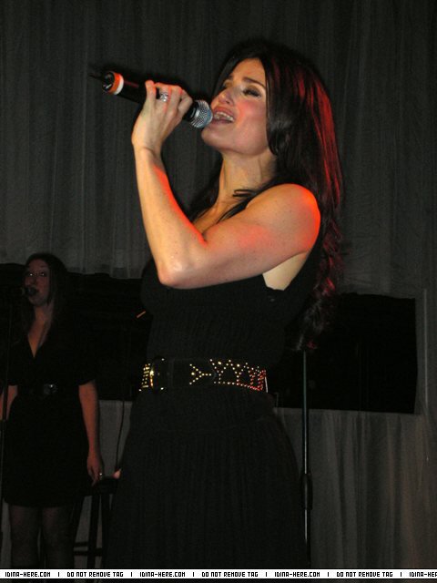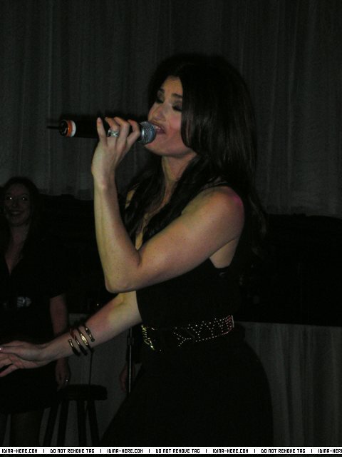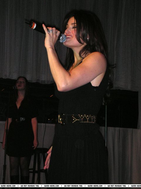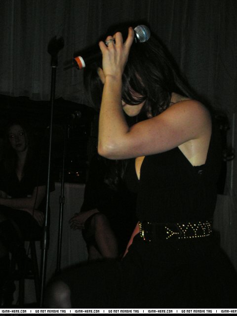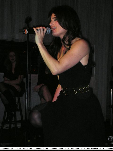 The show itself took place Thursday evening, Jan. 10, 2008, at 7PM. This special showcase was meant to be Idina’s official “coming out” introduction for Warner Brothers Records, and many (if not ALL) the higher-ups and head honchos were there, including what must have been half the LA company! The venue was called S.I.R., located on the famous Sunset Blvd in Hollywood, and it was decked out in beautiful fuchsia lights on white curtains, purple orchids, and cream/green candles. The mood was definitely chill and fit Idina’s style perfectly. Small tables circled the outside, but most people stood in the center of the room, in front of the stage. All the fans (around 10 of them total were lucky enough to snag a spot on the guest list) stood at the front of the stage, cheering her on with the rest of WBR.